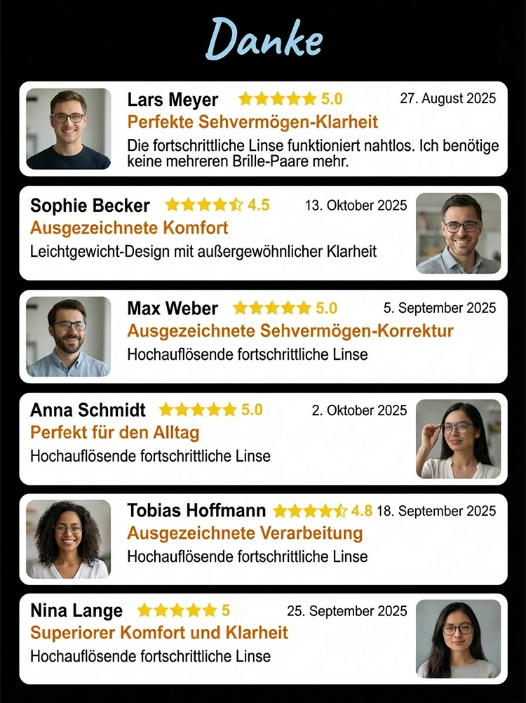👍 Eine Brille für alles: Kurzsichtigkeit, Weitsichtigkeit, Alterssichtigkeit und Blaulichtschutz. ✅ 100% Zufriedenheitsgarantie: Sollten Sie nach dem Probetragen nicht völlig überzeugt sein, bieten wir eine kostenlose Rückgabe oder einen Umtausch ganz ohne Portokosten an. 🛡️ Extra lange 10-Jahre-Garantie: Bei einem Defekt ersetzen wir die Brille direkt und kostenfrei durch eine komplettneue.